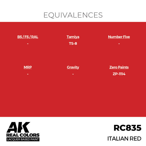 Modelárské akrylové farby typu lacquer primárne určené k nanášaniu pomocou striekacej pištole (airbrush). Vysoko kompatibilné s inými značkami akrylových farieb ako Tamiya alebo Gunze. Riediteľné buď originálnym riedidlom AK High Compatibility Thinner RC701 alebo inými riedidlami značiek Tamiya alebo Gunze, prípadne destilovanou vodou (viac informácií vo videu). Farby je možné použiť aj na štetec. Vyrobené podľa autentických fragmentov skutočných farieb.