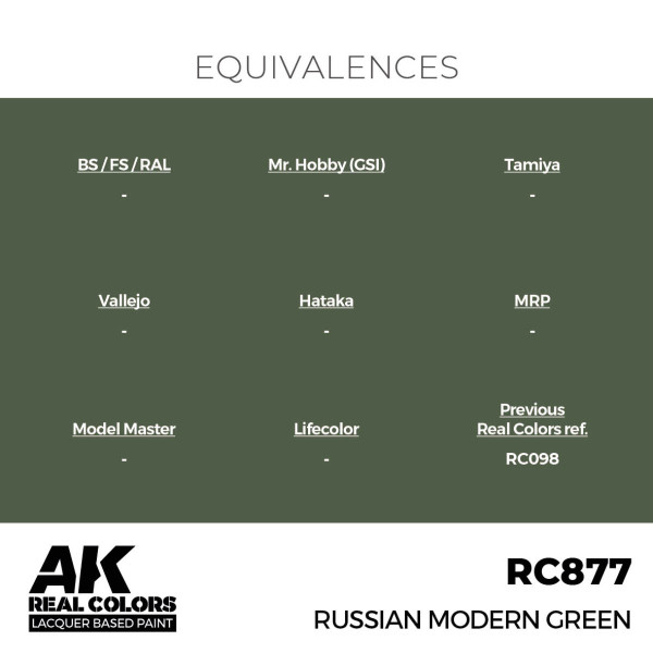 Modelárské akrylové farby typu lacquer primárne určené k nanášaniu pomocou striekacej pištole (airbrush). Vysoko kompatibilné s inými značkami akrylových farieb ako Tamiya alebo Gunze. Riediteľné buď originálnym riedidlom AK High Compatibility Thinner RC701 alebo inými riedidlami značiek Tamiya alebo Gunze, prípadne destilovanou vodou (viac informácií vo videu). Farby je možné použiť aj na štetec. Vyrobené podľa autentických fragmentov skutočných farieb.