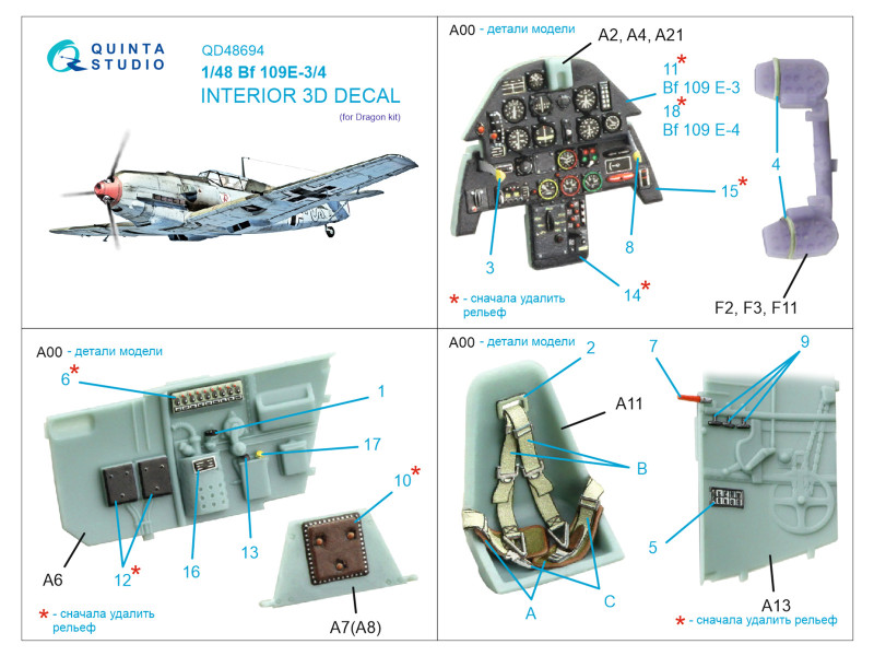 Bf 109E-3/E-4 3D-Printed & coloured Interior on decal paper (Dragon) | |